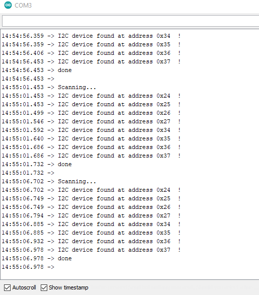 Zasadniczo ten protokół nie jest zgodny z I2C, bo nie ma adresacji urządzenia, ale skaner I2C z dokumentacji Arduino też powinien coś wykryć. Odpowiadać powinny adresy, pod którymi jest kontrola wyświetlacza oraz wartości segmentów. To pozwoli nam sprawdzić, czy poprawnie podłączyliśmy SDA i SCL.