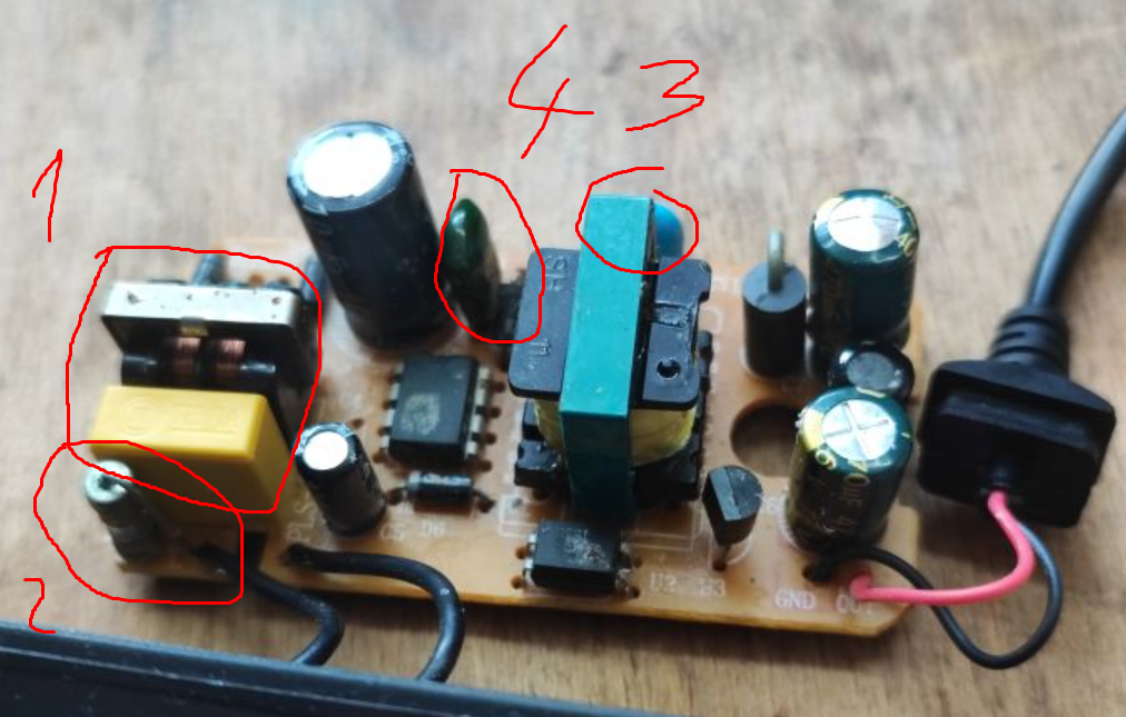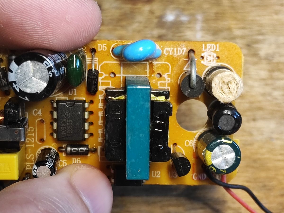 Jak na razie jest ok, to prosty zasilacz impulsowy, topologia flyback. Odstęp między stroną wtórną i pierwotną też wygląda w porządku, widzę nóżki transoptora (do regulacji napięcia - sprzężenie zwrotne):