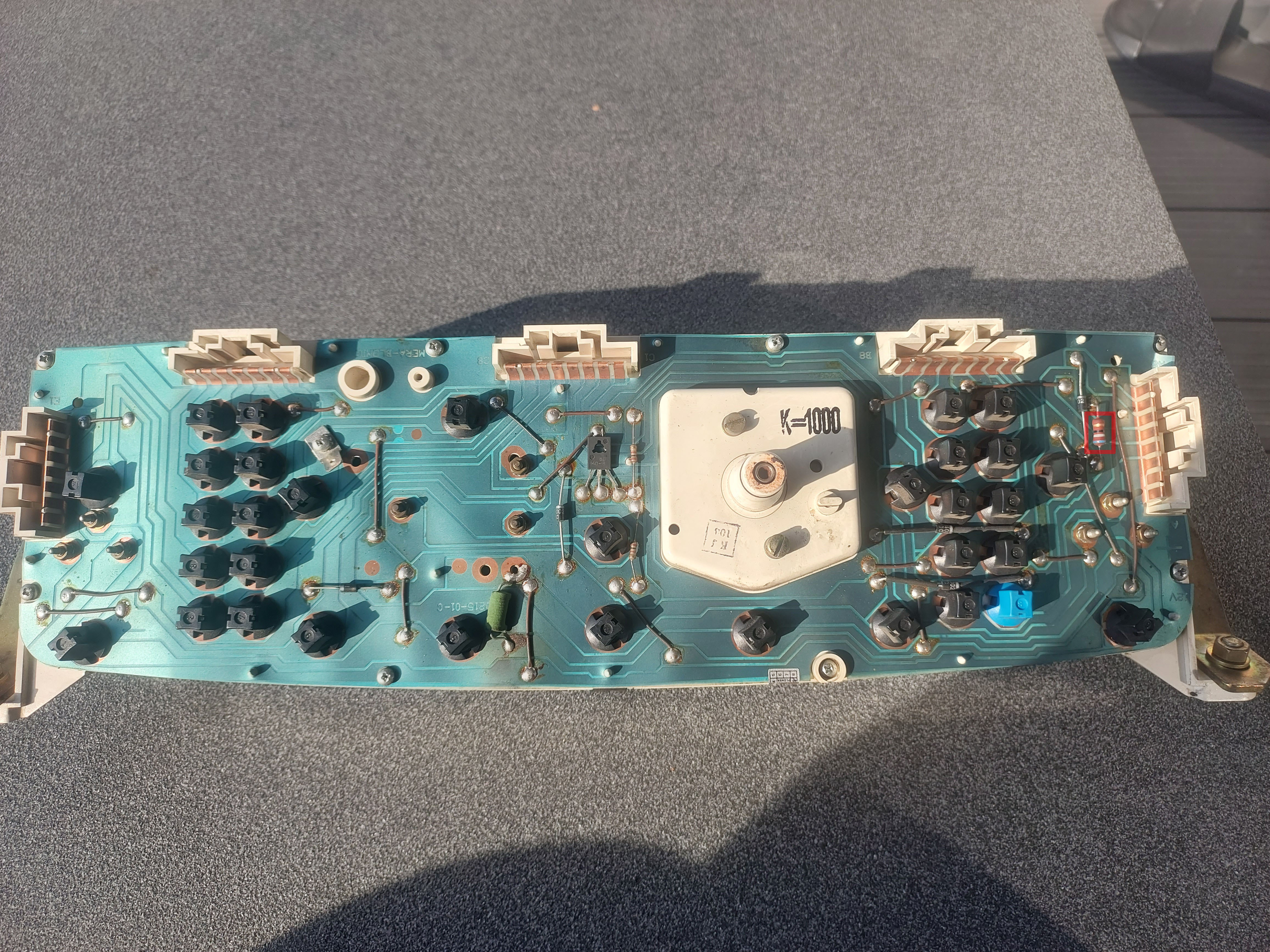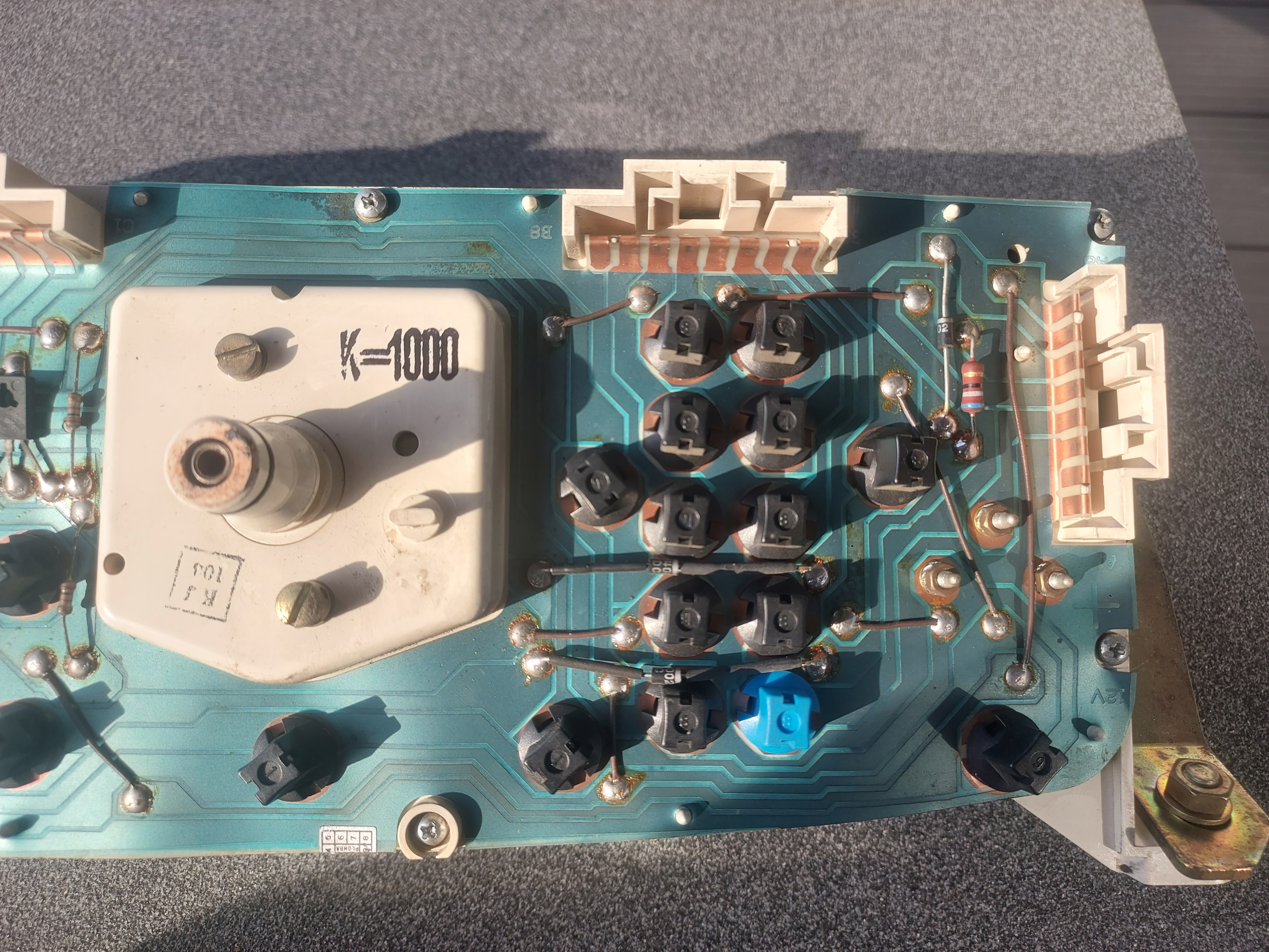 Po przekręceniu kluczyka na zapłon i podaniu napięcia na pin 6 kostki zaznaczonej na schemacie (kontrolka akumulatora - ładowanie) bardzo mocno grzeje się rezystor zaznaczony na zdjęciu licznika. Po odpaleniu auta kontrolka gaśnie (brak napięcia na pinie 6 i rezystor przestaje się grzać)