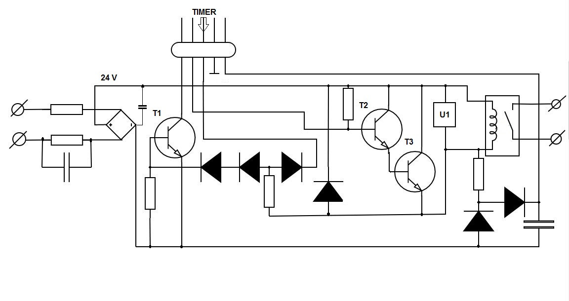 Posiadam programator czasowy Sinotimer, który działa niepoprawnie i do którego niestety nie posiadam schematu. Timer ten posiada 3 tryby pracy: ON, Auto, OFF, wybierane manualnie, a wada działania polega na tym, że niezależnie od wybranego trybu, styki robocze są zwarte. Z braku schematu, odtworzyłem układ z "natury" (mam nadzieję, że bez pomyłek), co prezentuję na zał. szkicu.