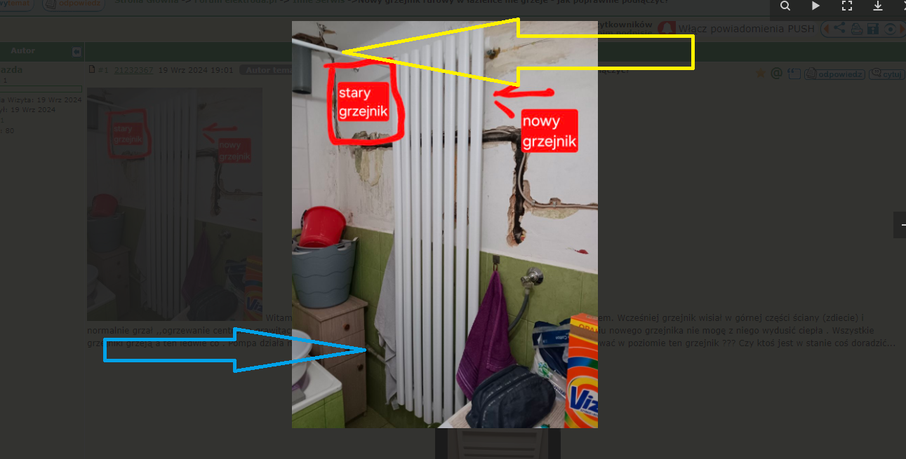 Witam. Zamontowałem nowy grzejnik rurowy w łazience tuż przed jej remontem. Wcześniej grzejnik wisiał w górnej części ściany (zdjęcie) i normalnie grzał ,,ogrzewanie centralne grawitacyjne, system z naczyniem wzbiorczym przelewowym,,. Po zamontowaniu nowego grzejnika nie mogę z niego wydusić ciepła. Wszystkie grzejniki grzeją, a ten ledwie co. Pompa działa normalnie, bojler też grzeje. Czy mam go podłączyć od góry, czy zamontować w poziomie ten grzejnik??? Czy ktoś jest w stanie coś doradzić...