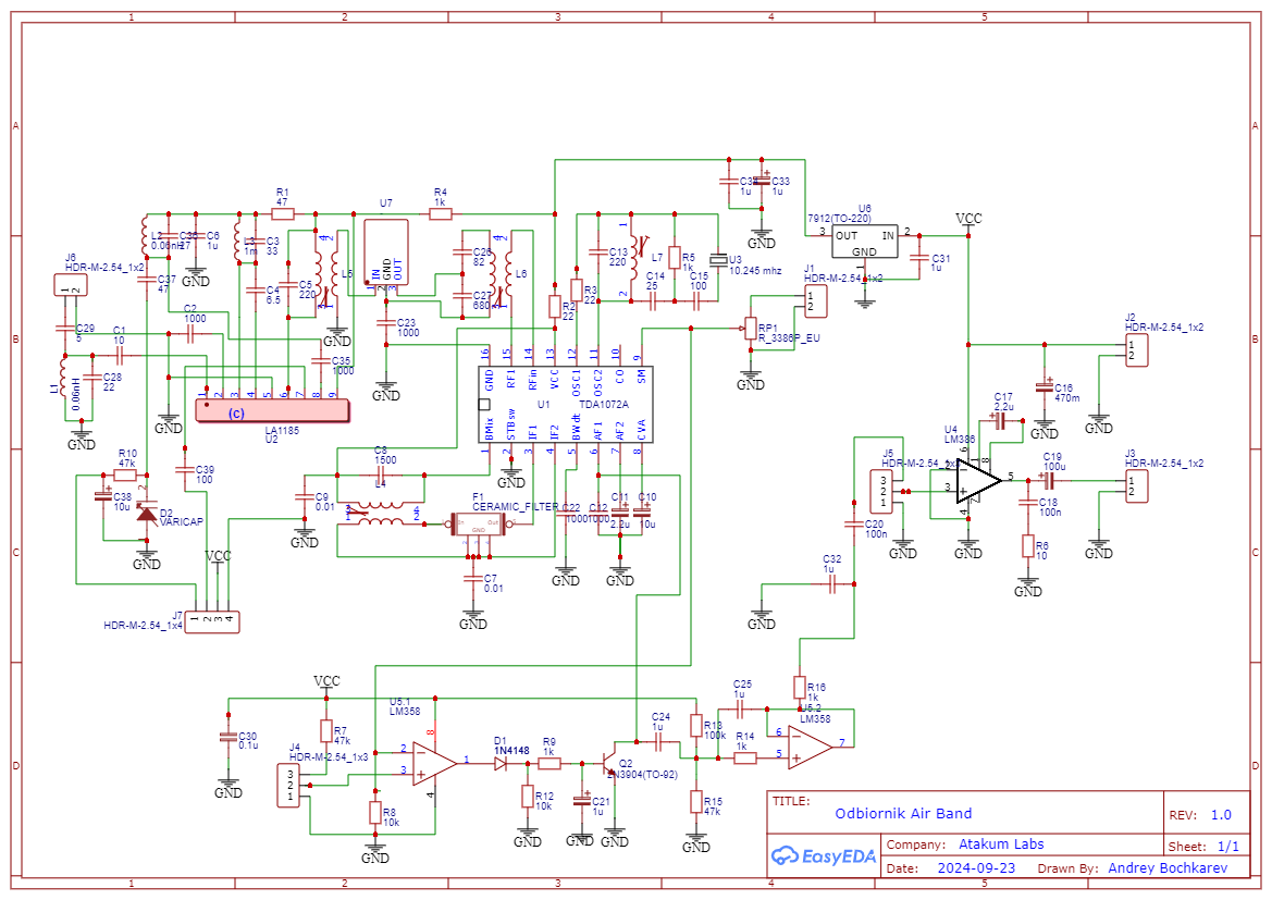 W pierwszym obwodzie stosowałem układ scalony typu AN7205 (=TA7358P =LA1185 =TA7358AP =KIA7358AP =KIA6058 – 2,5 PLN). Zawiera on wzmacniacz wejściowy, heterodynę, mieszacz, wzmacniacz pierwszej IF. Co do heterodyny to jest problem, ale o tym poniżej. Sygnał o częstotliwości 10,7 MHz wyjścia wzmacniacza pierwszej IF jest separowany przez filtr L5-C5 oraz piezo ceramiczny i idzie na kolejny (L6-C26-C27), który służy raczej do przystosowania optymalnego impedansu.