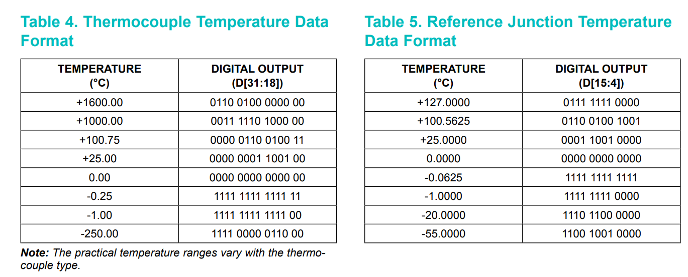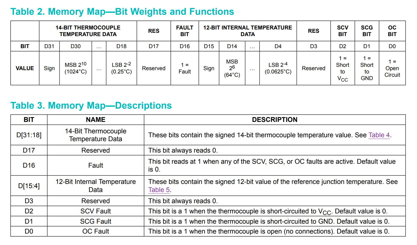 Mamy tu przede wszystkim 14-bitowy pomiar temperatury, dodatkowo 12-bitowy pomiar temperatury złącza odniesienia, dodatkowo mamy bit błędu (Fault) który jest niezerowy gdy jest wykryty któryś z problemów opisywanych kolejnymi bitami SCV, SCG, i OC, które kolejno oznaczają zwarcie do Vcc, do GND, oraz brak podłączenia czujnika. Dwa ostatnie brakujące bity są zarezerwowane i nie są używane w tej chwili, zwracają zawsze 0.