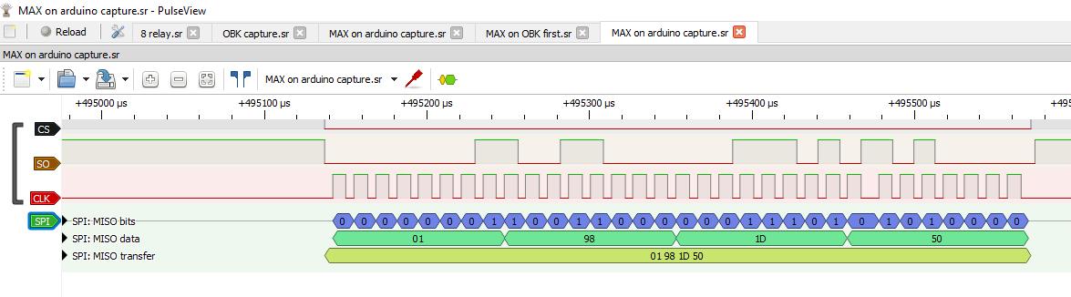 Pokażę tu jak łatwo uruchomić MAX31855 z Arduino a potem omówię jego protokół komunikacji. MAX31855 oferuje 14-bitowy pomiar temperatury z zakresu zależnego od użytej sondy, od -270°C aż do 1800°C. MAX31855 oferuje prosty protokół komunikacji oparty o SPI, zasadniczo odczytujemy z niego tylko jedno słowo 32-bitowe, co pozwała na jego łatwą implementację na mikrokontrolerze. Pracuje on na napięciu 3.3V, choć niektóre dostępne z nim modułu mogą ruszyć i na 5V dzięki dostępnemu na pokładzie LDO.