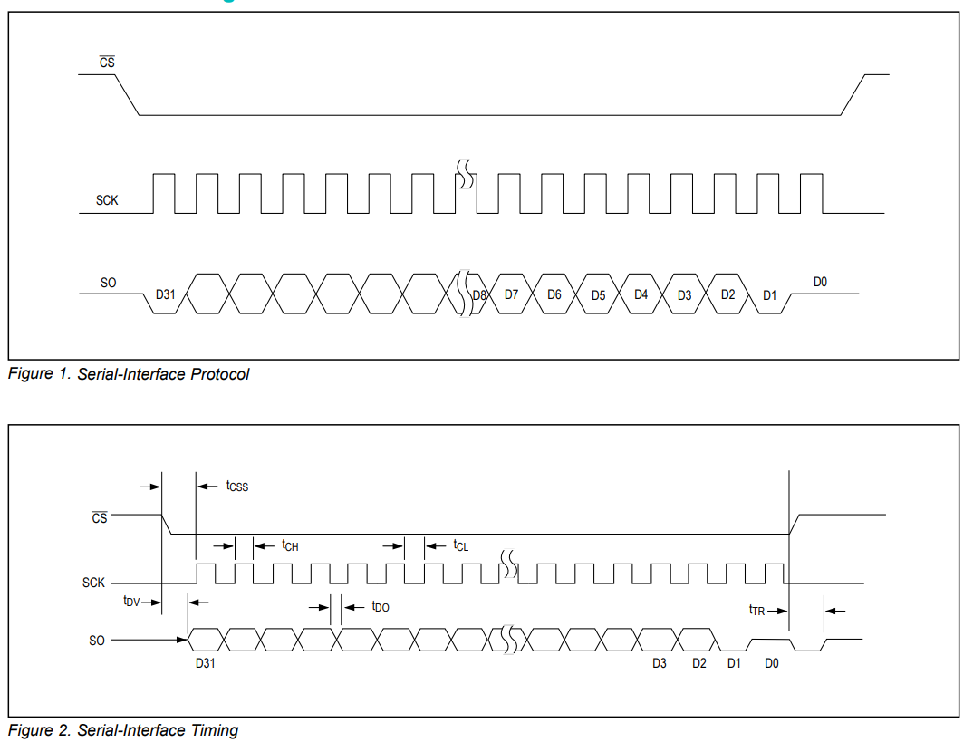 MAX31855 korzysta z SPI do komunikacji, ale w tym przypadku całość komunikacji zamyka się w jednym odczycie 32-bitowego słowa. Nie ma dodatkowych rejestrów, ustawień, itd. Wszystko jest bardzo proste. Ilustrują to dobrze rysunki "Serial-Interface Protocol" i "Serial-Interface Timing" z nowy katalogowej: