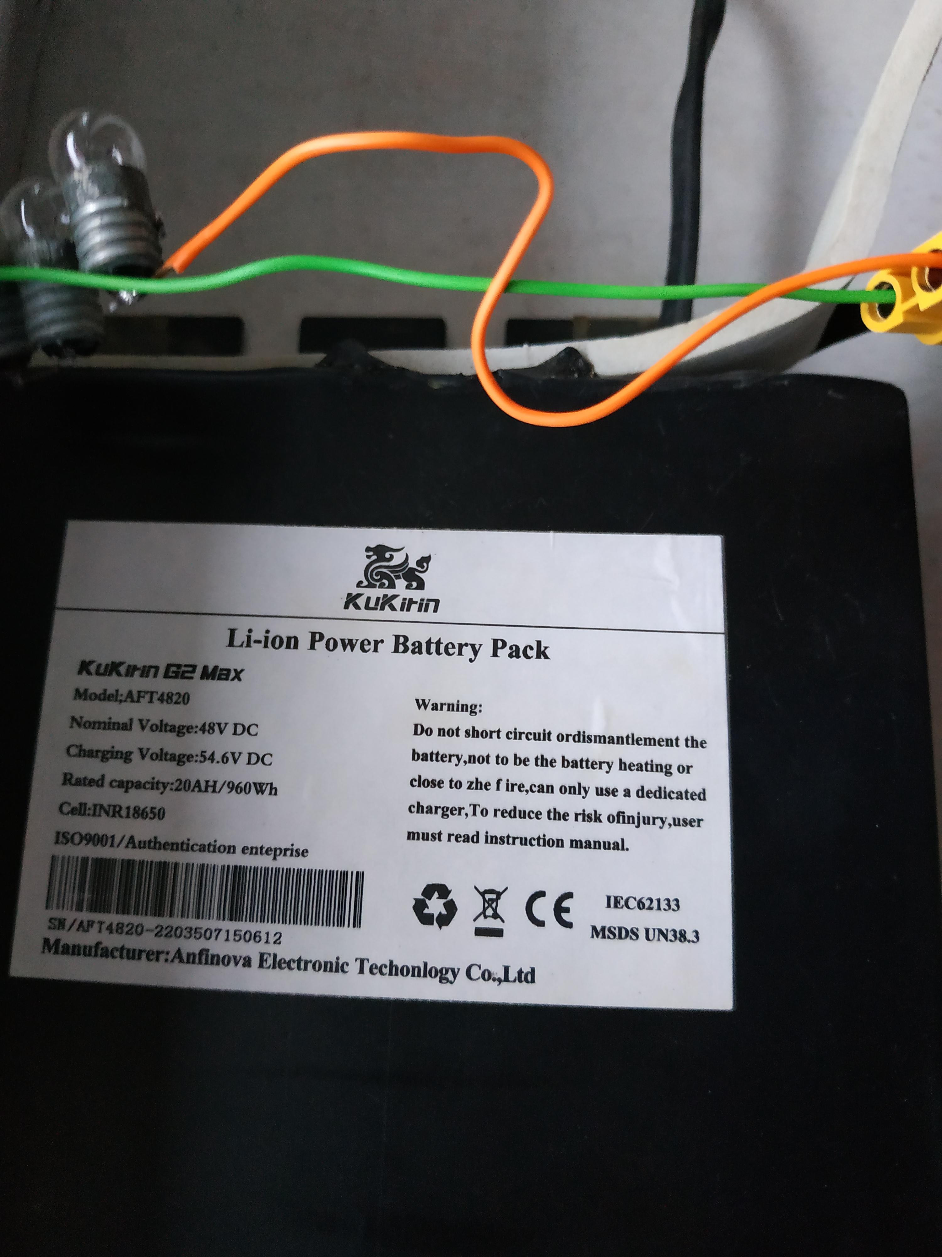 Zdjęcie przedstawia akumulator skutera elektrycznego kukirin g2 max. Na wyjściu nie ma napięcia, akumulator nie jest ładowany. Okresowo napięcie może się pojawiać i wtedy akumulator może być ładowany.