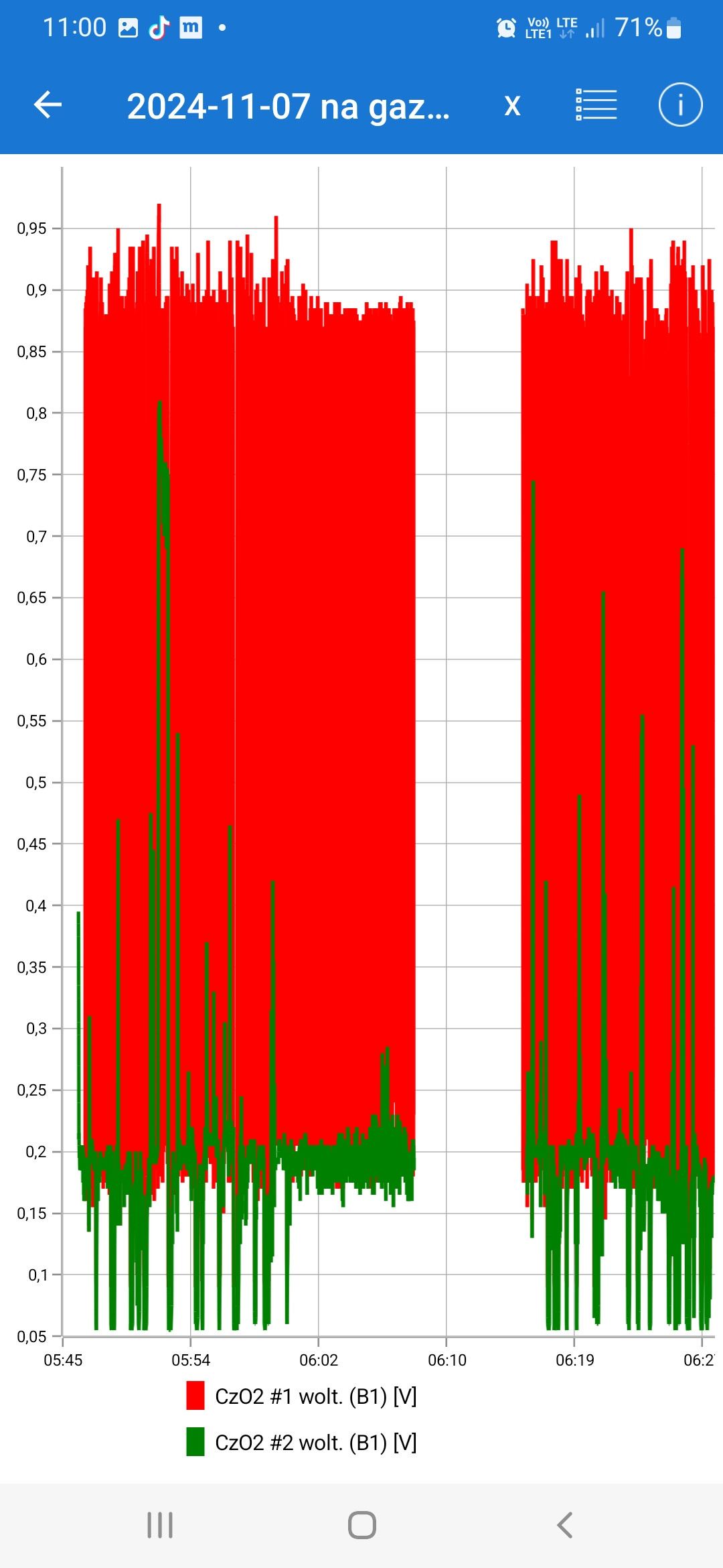 A wykres podwójny z jazdy na benzynie. Dodam, że na benzynie przy jednostajnej jeździe jest 0,85 V.
