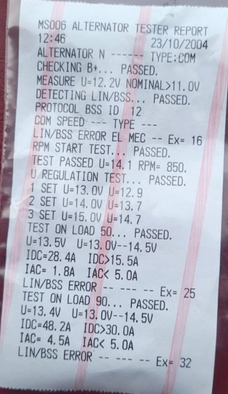 Chciałem profilaktycznie sprawdzić alternator. Wymontowałem go i oddałem elektrykowi. Po "regeneracji" po uruchomieniu silnika po kilku, kilkunastu sekundach na wolnych obrotach nie ma ładowania. Wystarczy lekko zwiększyć obroty i ładowanie wraca. Wymontowałem go ponownie i oddałem na reklamację.Elektryk niby wymienił regulator, zrobił test i stwierdził że alternator jest sprawny. Niestety nie jest. Na wydruku nie mi się podobają mi się pozycje ERROR. Czy ktoś mógłby stwierdzić na podstawie wydruku czy alternator jest sprawny?