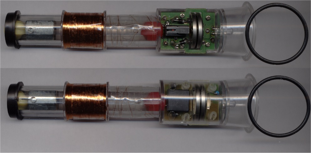 Metalowy rdzeń to walec magnesu neodymowego, który porusza się w karkasie cewki. Ilość zwojów niewiadoma. Następnie napięcie indukowane w cewce jest prostowane pełnookresowo mostkiem prostowniczym 4 diodowym.