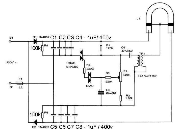 Postanowiłem wykonać swój pierwszy stroboskop. Jako schemat wybrałem "stroboskop 30j" dostepny na elektrodzie i postanowiłem go zmodyfikować. Link do orginalnego schematu jest tutaj: http://www.elektroda.net/download/dwpl.php?file=inne/tsm/stroboskop%2040j.djvu . Ponieżej zamieściłem schemat który zmodyfikowałem. Dysponuje 8 kondensatorami każdy po 1uF (są to radzieckie kondensatory olejowe) - a wyglądają dokładnie tak - https://www.elektroda.pl/rtvforum/topic413870.html . Myśle, dać 4 na strone. Znacznie obniżyłem wartości rezystorów R5 oraz R6 gdyż One odpowiadają za prąd ładowania kondensatorów, a myśle, że w moim wypadku prąd może być większy ze względu na rodzaj kondensatora. Jak uważacie, czy to wypali ?? Czy mój stroboskop da dostateczny błysk ?? Jaką moc mają mieć rezystory R5 i R6 ?? ps. Jak zrobie strobola to zamieszcze foty na elektrodzie