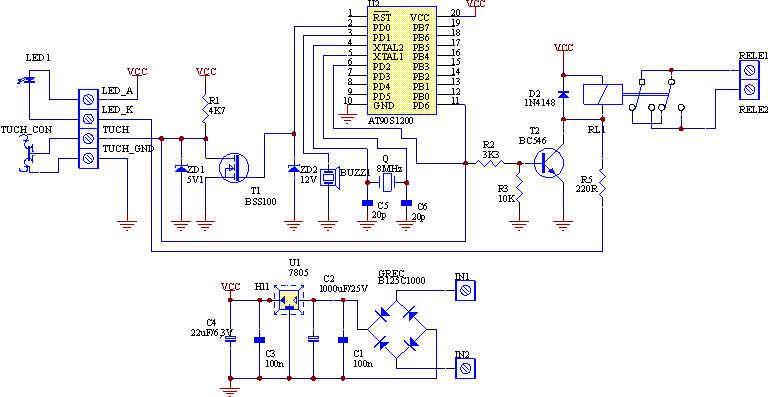 W załączniku znajduje się przykładowy układ obsługujący pastylki Dallas DS1990A (koszt około 16PLN za pastylkę). Jego działanie jest bardzo proste - mikrokontroler odczytuje numer pastylki po czym weryfikuje ten numer z informacją zapisaną w EEPROM. Jeżeli wszystko jest poprawnie wysterowuje przekaźnik, który np. steruje otwarciem drzwi. Oprócz tego generuje dźwięk potwierdzający. Przekaźnik 5V.