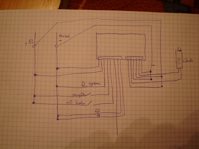 w miejsce migaczów i syreny wstawiłem diody, w miejsce stacyjki i wył krańcowego - switch'e, odcięcie zapłonu zostawiłemw powietrzu ale nawet jak zewre do masy efekt jest identyczny.