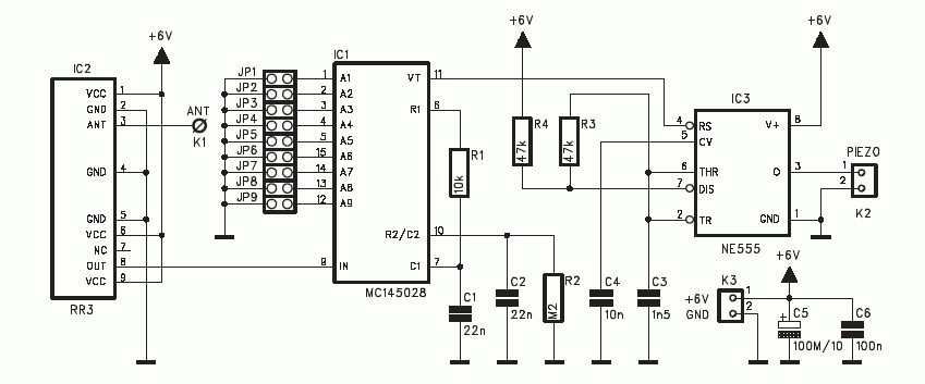 Jest to przykład często pojawiającej się konstrukcji radiowego sterowania na częstotliwości 433MHz. Dzięki wykorzystaniu gotowych modułów nadajnika i odbiornika 433MHz cała konstrukcja jest trywialnie prosta i składa się z kilku elementów. Wroli nadajnika wciela się moduł RT1 wraz z koderem MC145026. W roli odbiornika mamy RR3 oraz MC145028P