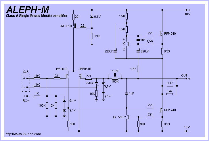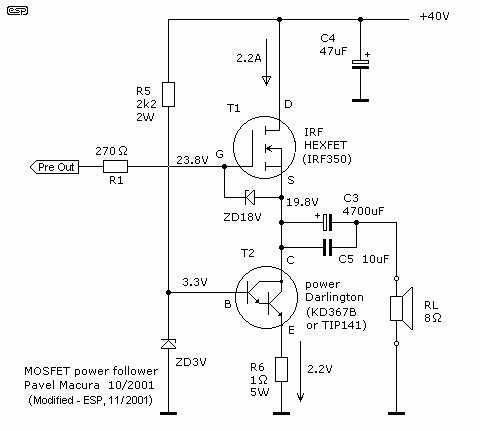 Prosty wzmacniacz klasy A zbudowany na jednym tranzystorze MOSFET z kanałem typu N oraz jednym tranzystorze Darlingtona NPN. Przy zasilaniu 40V wzmacniacz dostarcza do głośnika 18W przy 8 ohm. Wzmacniacz pobiera 88W mocy z zasilacza bez względu na dostarczoną moc do głośnika. Oczywiście T1 i T2 wymagają dobrego chłodzenia. Wzmacniacz cechuje bardzo dobra jakość dźwięku, szerokie pasmo.