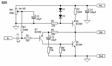 Na pierwszym schemacie przedstawiono przedwzmacniacz. Przedwzmacniacz wymaga dosyć wysokiego napięcia wejściowego - 4V, jednak zmniejszając R4 do 3k3, C3 zwiększając do 100uF będzie wymagane tylko napięcie wejściowe do 1.5V aby uzyskać pełną moc z wzmacniacza.
