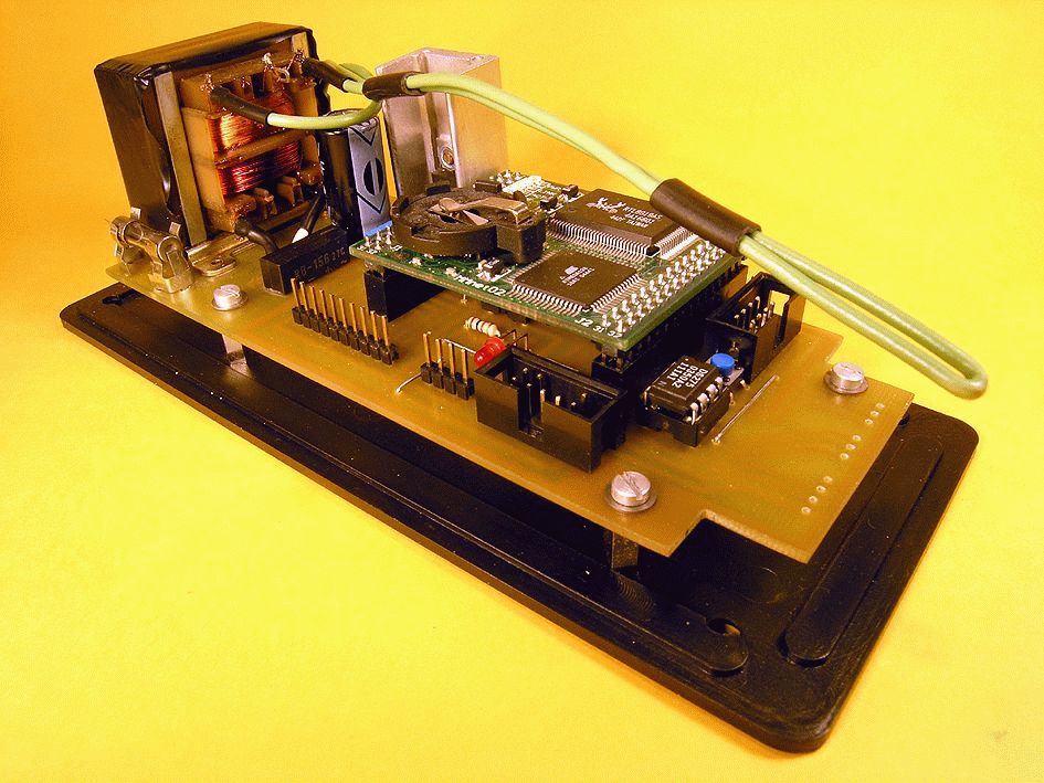 Część stacjonarna to niewielkie pudełko zawierające serce sytemu. Ta część projektu zbudowana została w oparciu o moduł internetowy f-y Propox, w jego skład wchodzą: wydajny mikrokontroler ATMega128, kontroler Ethernet RTL8019 , zewnętrzna pamięć RAM, itp. Do połączenia z Internetem wymaga tylko pasywnej część interfejsu Ethernet (trafo, kondensatory). Moduł ten wraz z zasilaczem i paroma innymi elementami umieściłem na płytce drukowanej - patrz zdjęcie 'matka.jpg'.