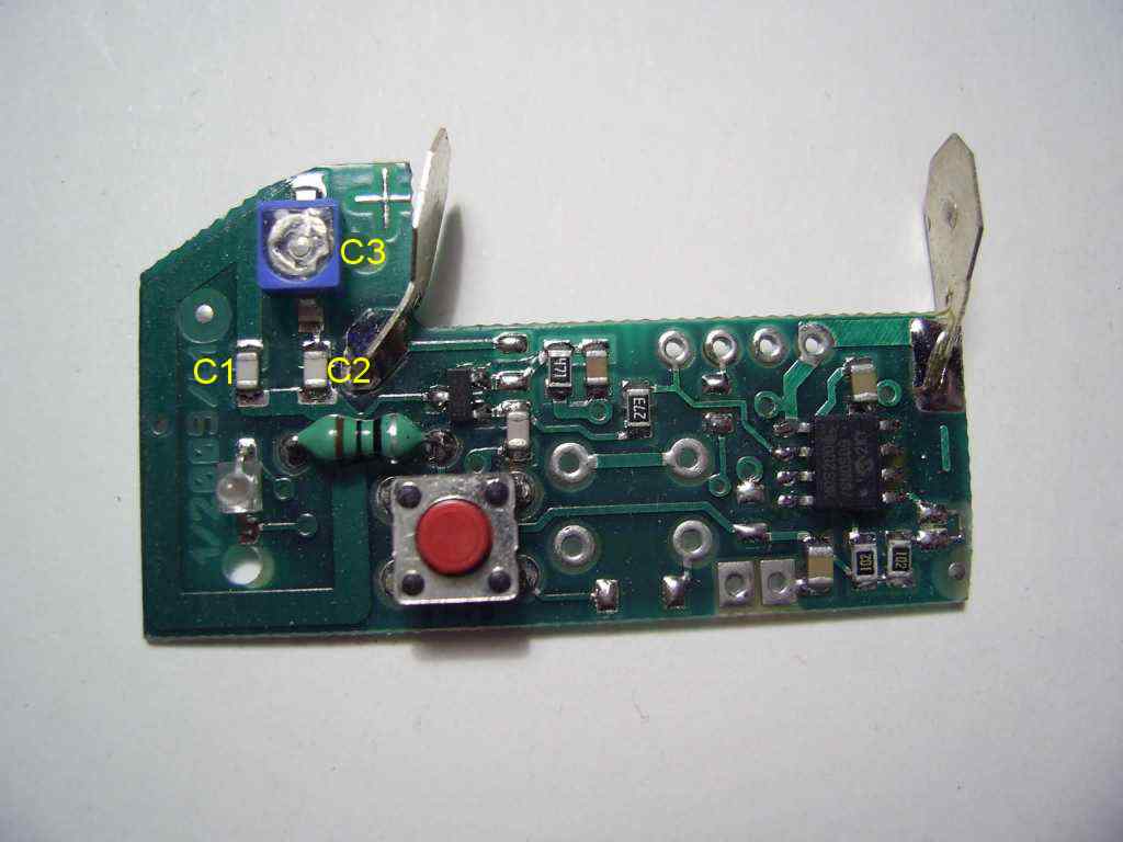 A może znacie wartości kondensatorów i trymera w obwodzie anteny? Są tam dwie pojemności SMD (C1 i C2) i trymer (C3). Być może dałoby radę zestroić na płytce którą zrobiłem ale musze znać wartosci elementów bo chyba trymer mi poległ podczas przeprowadzki na nową płytke. Dołaczam fotke oryginalnego pilota.