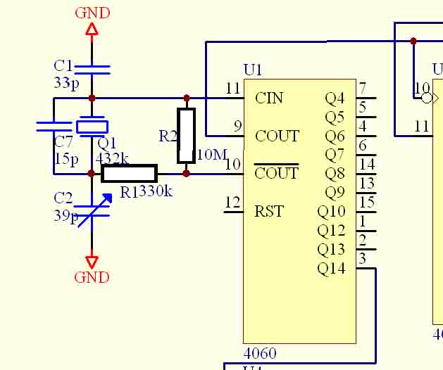 Chodzi o współpracę układu 4060, z rezonatorem ceramicznym 432kHz. Projektuję pewne urządzenie i pasuje mi zastosować właśnie ten rezonator. Jednak nie chce on wystartować z typowymi pojemnościami do kwarcu, tzn. 10pF i trymer 39pF. Próbowałem zmieniać wartości, ale nic z tego. Z kwarcami nigdy nie miałem problemów. Dodam, że układ zasilany jest z 3V (3 akumul. R6 z obciążeniem daje właśnie 3V).