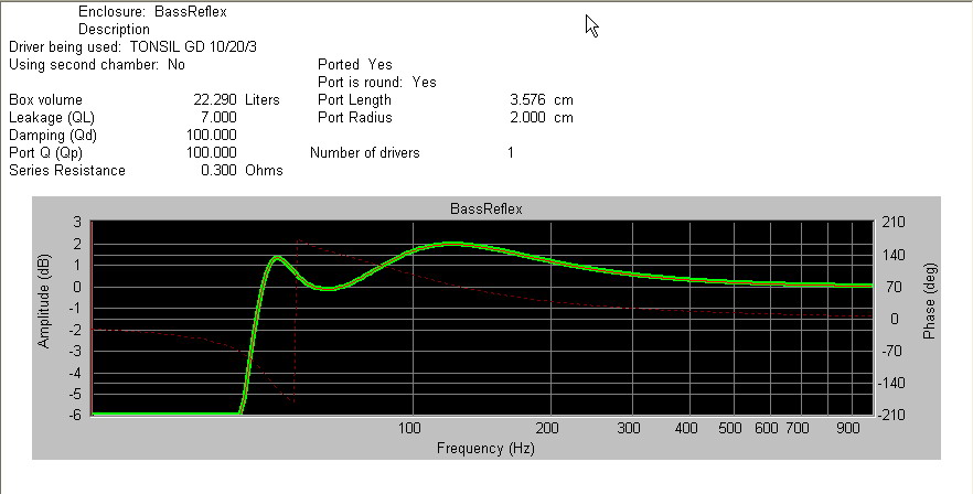 Optymalna obudowa , którą wyliczył SpeakerWorkshop (według współczynnika EBP najlepszą obudową będzie bass-reflex- strojenie Czebyszewa- 51,04[Hz]):