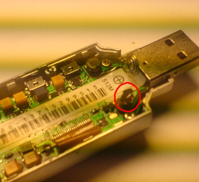 Następnie, bez włożonych baterii, za pomocą płaskiego śrubokręta, dotknij kilka z 8 IO nóżek chipu pamięci. Cały czas trzymając zwarte nózki, podłącz odtwarzacz do komputera.