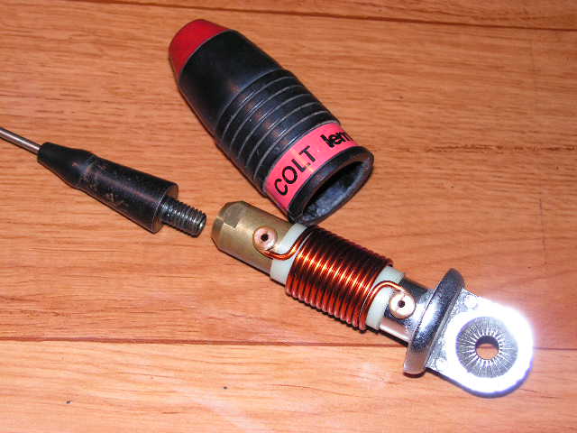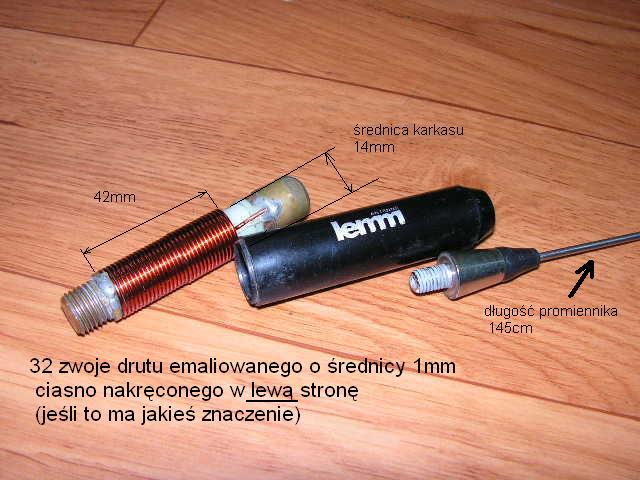 Na fotkach widać również antenę lemm colt, której cewka nie kryje już takich tajemnic jak poprzednie modele. Antena jak widać jest przystosowana do innego typu główki, ale na upartego da się ją przykręcić do tej którą posiadam. Z tego co pamiętam (próby robiłem dawno i nie posiadam oryginalnego bata do niej) promiennik tej anteny ma mieć około 1550mm.