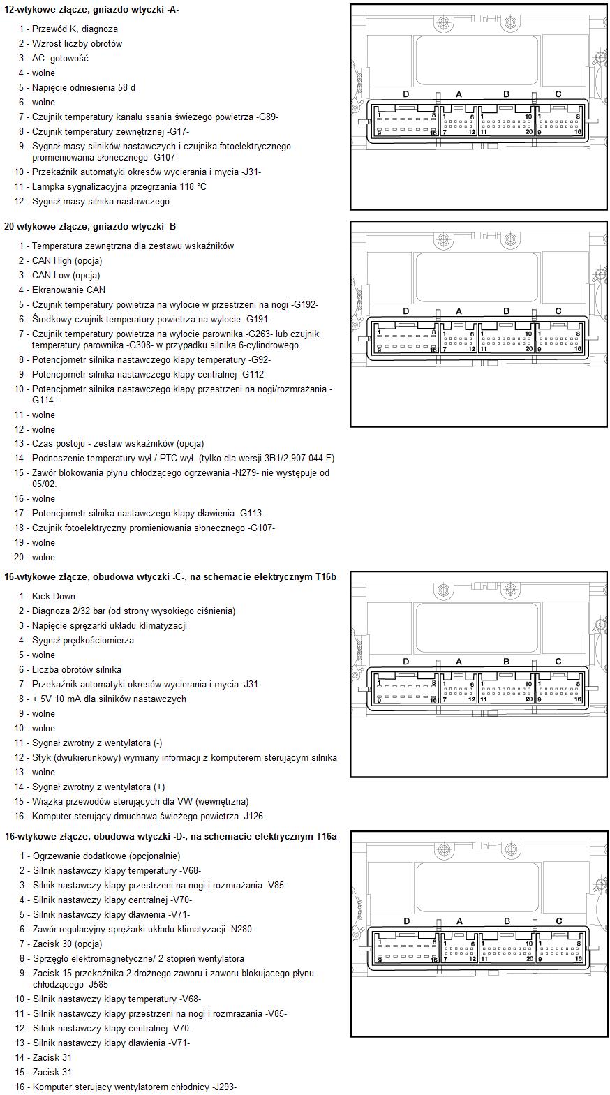 Zmierzyłem miernikiem pozostałe piny i tak: na pin 7 wtyki D na samochodzie jest doprowadzane stałe 12v (co też wynika z rozpiski), oraz na pinie 9 wtyki D idzie 12v po stacyjce. Podejrzewam że jeszcze na któryś z tych pinów musi być podane napięcie żeby podświetlenie przełączników zadziałało na stole (tego nie sprawdziłem) ale zakładam że jednocześnie włączy to klimatronika.