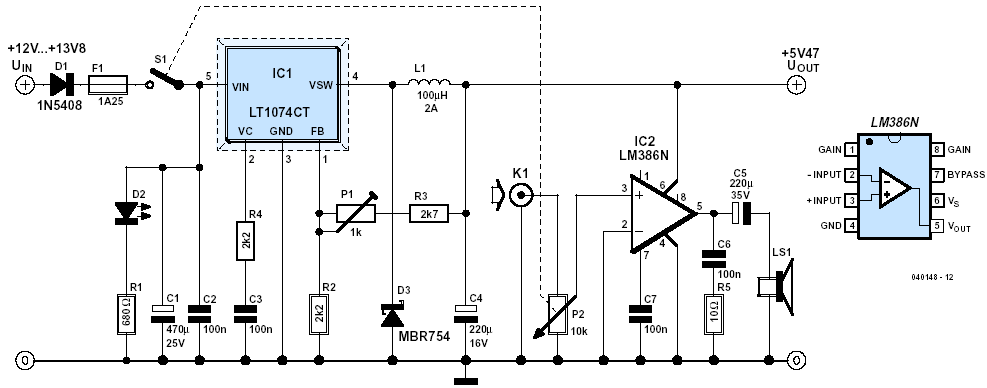 Instalując PDA z nawigacją w samochodzie powinniśmy zadbać o zasilanie z akumulatora oraz delikatne wzmocnienie sygnału audio w przypadku korzystania z nawigacji głosowej. Ten schemat pozwala na wykonanie urządzenia składającego z zasilacza +5V/5A oraz wzmacniacza 400mW. Dzięki temu PDA będzie mógł być zasilany z akumulatora a komunikaty głosowe zostaną wzmocnione. Pewien problem może być tylko ze zdobyciem odpowiedniej wtyczki zasilającej dla PDA. P1 służy do delikatnej regulacji napięcia wyjściowego, P2 służy do regulacji wzmocnienia wzmacniacza