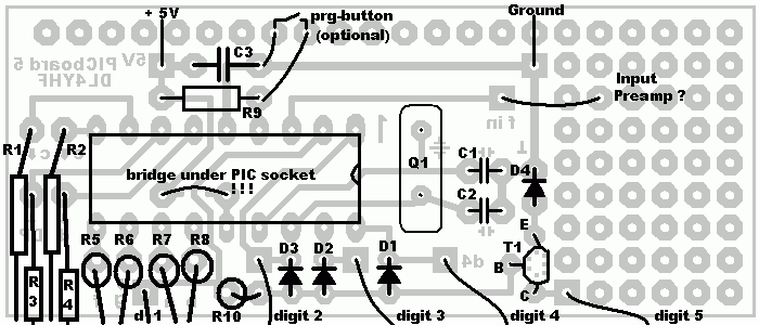 Układ zbudowano na dwa sposoby. Pierwszy wariant jest bardzo prosty pod względem wykonania jednak okrojono o jeden segment prezentowane wyniki pomiaru - 4 segmenty wyświetlacza.