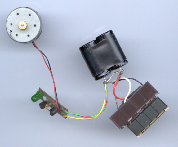 Jest to w zasadzie silniczek, który jest zasilany z panelu solarnego. Bardzo proste wykonanie a użyte elementy można znaleźć w swoich elektronicznych zbiorach. Zasada działania jest prosta. Kondensator jest ładowany przez panel słoneczny, jeżeli kondensator zgromadzi wystarczający ładunek to następuje oddawanie energii dla silniczka.