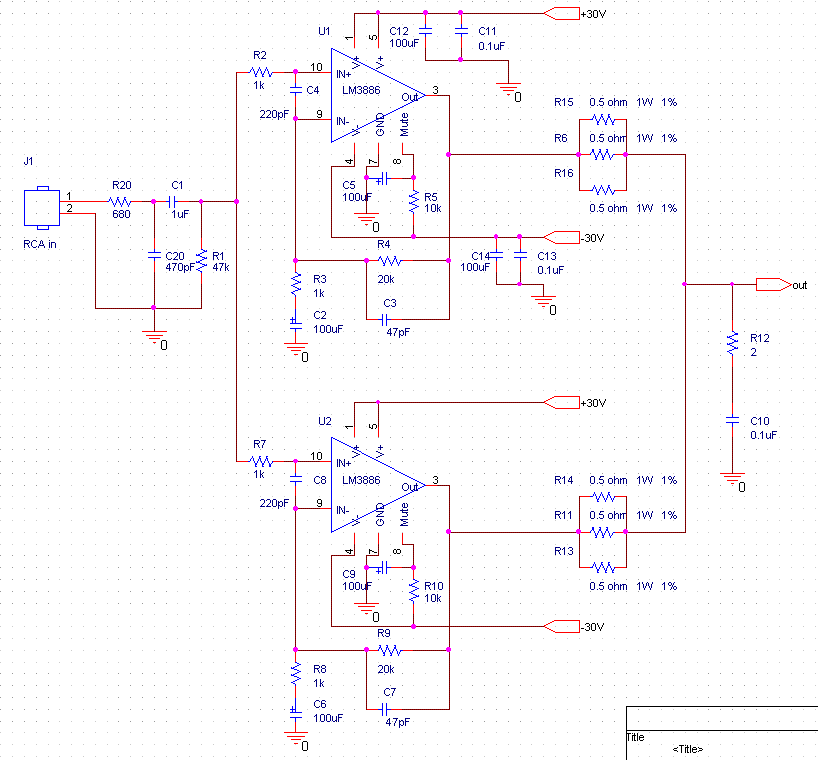 Wzmacniacz dostarcza mocy 50W dla obciążenia 8ohm i 100W dla obciążenia 4ohm i używa dwóch LM3886 połączonych równolegle. Wzmacniacz cechują niewielkie zniekształcenia, i bardzo dobra jakość dźwięku. Zasilanie można zrealizować na dwa sposoby - za pomocą LT1083 lub LM317 i TIP2955