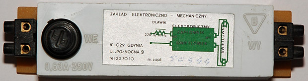 Na fotografii widać, że zapłonnik posiada dodatkowo bezpiecznik 0,63A włączony w szereg z zaciskami wejściowymi, pełni on rolę zabezpieczenia na wypadek gdyby ktoś próbował podłączyć układ z pominięciem dławika - bez bezpiecznika skończyłoby się to spaleniem układu.