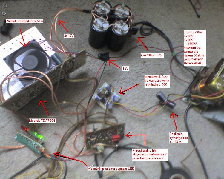 Do jeszcze nie powstałej kolumny mam już zrobiony wzmacniacz na 2xTDA7294 + przesuwnik fazy do subwofera z płynną regulacją o 360` + przestrajany filtr aktywny do subwofera. (WSZYSTKIE UŻĄDZENIA ZROBIONE BYŁY NA BAZIE SCHEMATÓW Z ELEKTRODY)