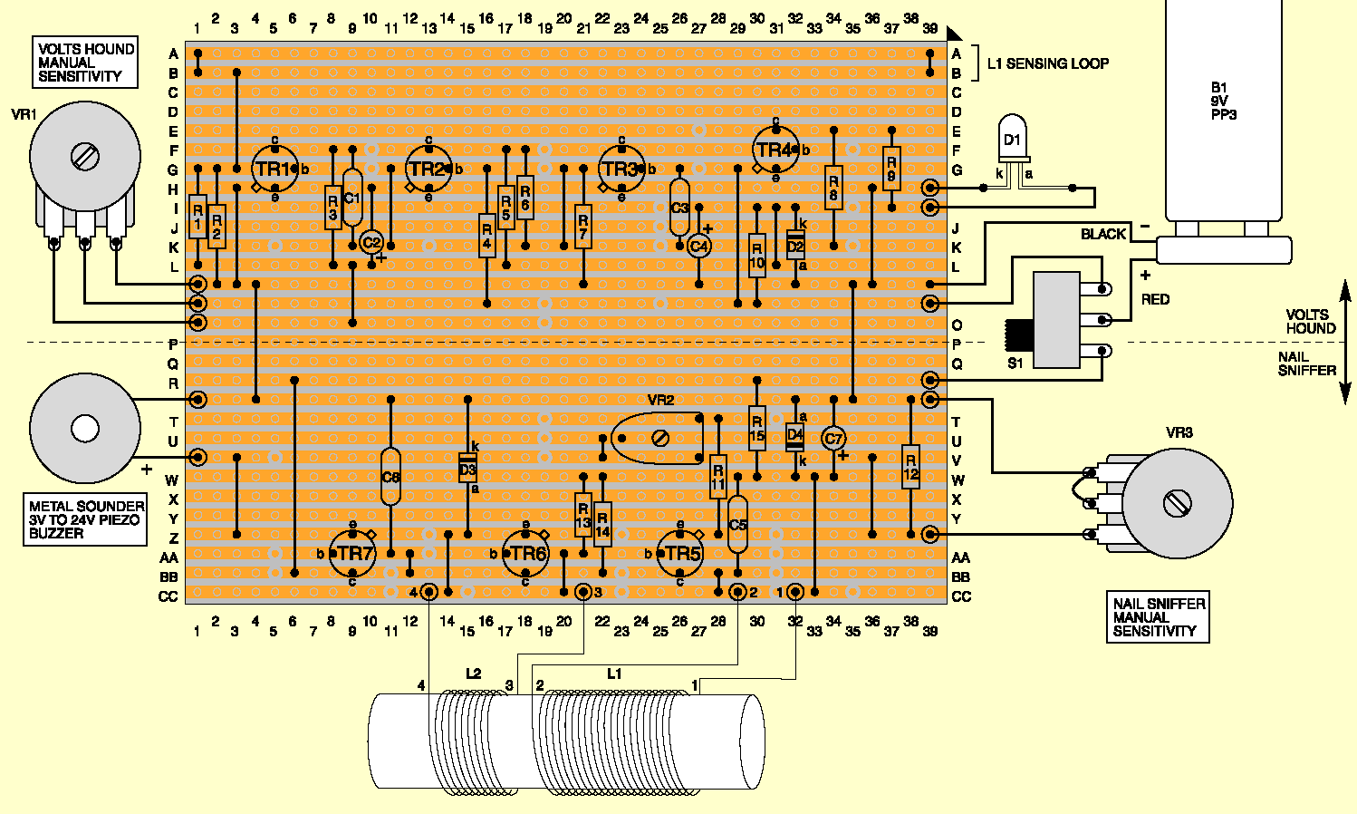 Regulacji czułości dokonujemy za pomocą VR2 i VR3. Czujnikiem są dwie cewki L1 i L2. Cewka L1 posiada 80 zwojów, cewka L2 40 zwojów. Nawinięte zostały drutem o średnicy 0,35mm blisko siebie na pręcie ferrytowym o średnicy 10mm i długości 75mm