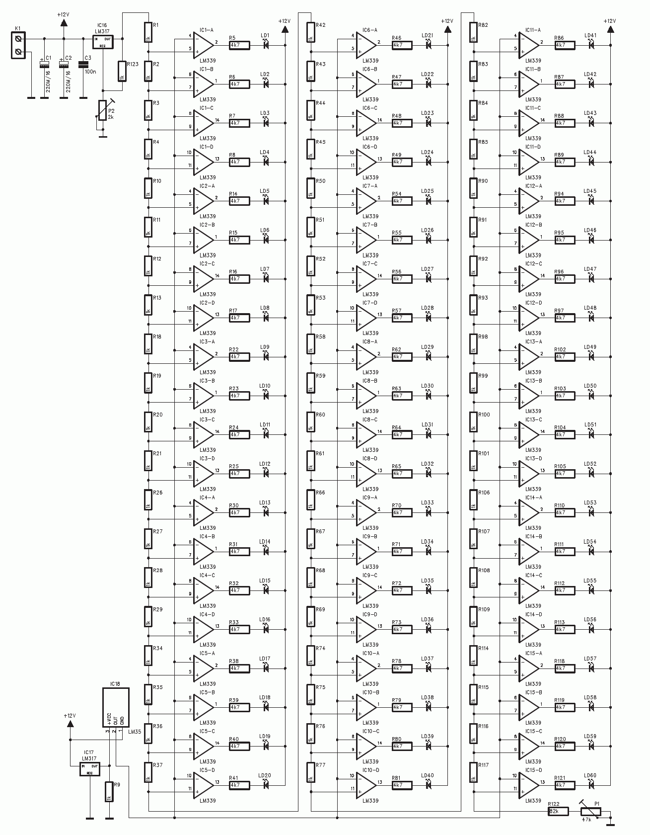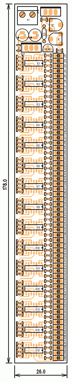 Jeden z największych termometrów wykorzystujący aż 60 diod LED ułożonych w postaci linijki świetlnej, wyglądem imitujący zwykły termometr rtęciowy. Każda dioda LED reprezentuje zmianę o jeden stopień C. Większość elementów SMD. Czujnikiem jest popularny układ LM35. Strojenie polega na ustawieniu wartości wyjściowego napięcia z LM317 na wartość 1,68V za pomocą P2 i ustawieniu napięcia na R122 na wartość 1,08V za pomocą P1.