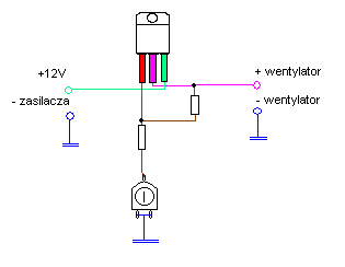 Jest to regulator obrotów do wiatraczka w komputerze. Nie mam pojęcia jak ja mam podpiąć ten układ scalony i potencjometr nastawny.