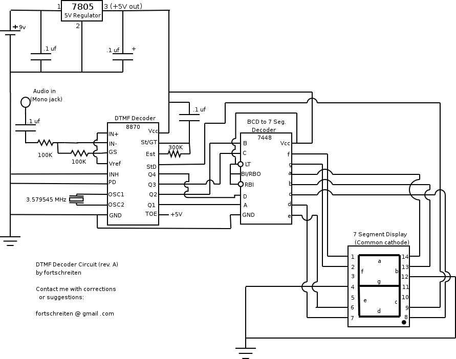 Zaprezentowany układ pozwala na dekodowanie sygnału DTMF. Niestety nie posiada żadnej pamięci dekodowanych cyfr, jedynie pozwala na wyświetlenie aktualnego znaku reprentowanego przez ton DTMF na wyświetlaczu LED. Wykorzystano scalony dekoder DTMF 8870 oraz scalony konwerter 7448 kodu BCD na 7 segmentowy wyświetlacz . Zasilanie 5V. Wejście audio monofoniczne.