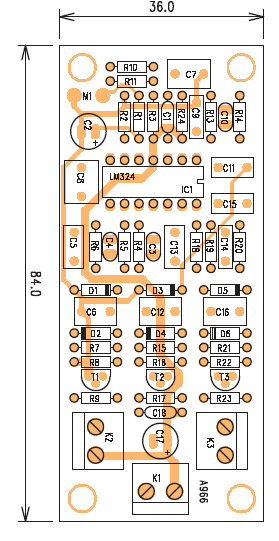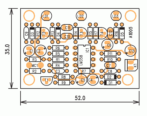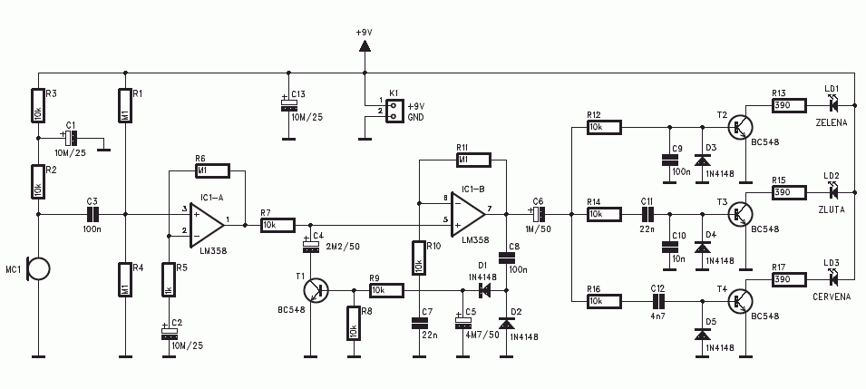 Układ pozwala na wysterowanie trzech różnokolorowych diod LED w rytm dźwięku. Cechą charakterystyczną tego rozwiązanie jest to, że sygnał pobierany jest z zewnątrz za pomocą mikrofonu. W obwodzie możemy łatwo wyróżnić kilka podstawowych bloków. Jest to mikrofon z przedwzmacniaczem zbudowanym w oparciu o LM324 oraz zestaw 3 filtrów aktywnych każdy wydzielający inną częstotliwość akustyczną - niską, średnią i wysoką. Warto zwrócić uwagę na filtry, jak można zauważyć każdy filtr akustyczny jest niemal taki sam różniący się tylko kondensatorami w sprzężeniu zwrotnym (C4, C10, C14, C3, C9, C13). Po filtrach znajduje się mini układ wykonawczy w postaci tranzystorów BC548, jako że diody nie potrzebują dużego prądu. Zamiast diod LED możemy wstawić optotriak a zanim triak celem wysterowania np. żarówek na 230V.