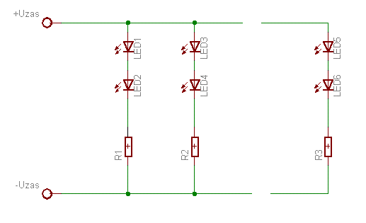 Kolejne diody podłączaj z własnymi rezystorami, tzn jeden rezystor do jednej gałęzi diod.