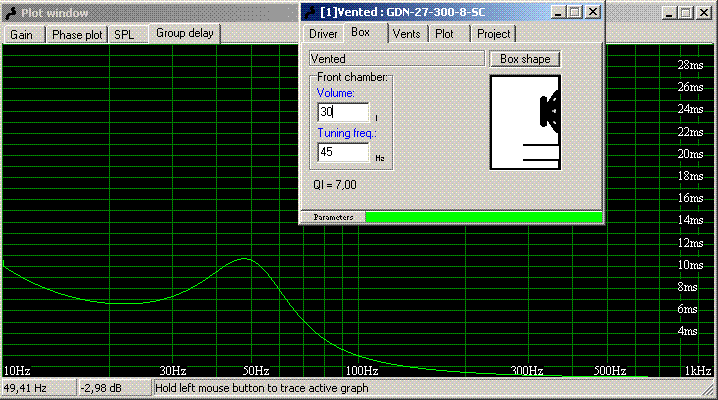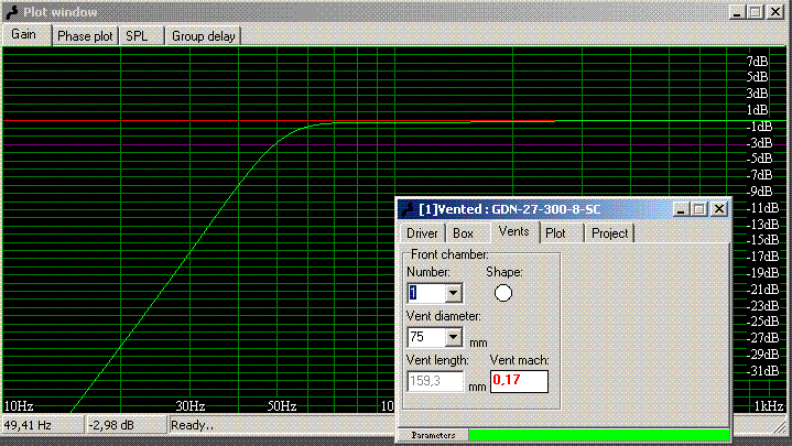 Otóż sprzęt ma być uzupełnieniem kina domowego oraz altusów (nieoryginalne przetworniki), pomieszczenie odsłuchowe ok. 12 m², głównie do muzyki techno/hardstyle oraz filmów. Napęd to mostek TDA7294 + filtr aktywny z regulacją odcięcia oraz filtrem subsonicznym (20Hz). W przyszłości coś na tranzystorach. Głośnik to STX GDN-27-300-8-SC, reszta widoczna na screenach. Oto moje symulacje. Czy to dobrze zagra? Dzięki za pomoc.