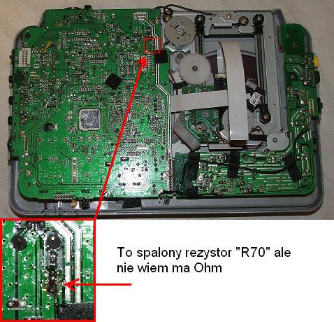 Bo spalił mi rezystor R70. Ile Ohm ? Dlatego odtwarzacz nie mogł odczytać nośnik DVD i ekran pokazuje "No valid disc" czyli niesłuszny dysk. w załaczniku jest jpg