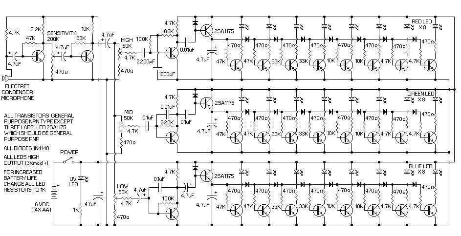 Sam obwód składa się z mikrofonu elektretowego podłączonego do przedwzmacniacza z regulacją czułości. Sygnał jest potem rozdzielany na trzy kanały z indywidualną regulacją poziomu. Każdy kanał posiada oddzielny układ filtrujący, więc reagować będzie na różne częstotliwości. Stamtąd sygnał trafia na linijkę LED-ów.