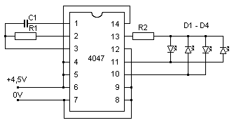 Generator dziala bez problemow. Daje on efekt przemieszczajacego sie punktu, najpierw zapala sie pierwsza dioda i gasnie, potem druga dioda i gasnie, trzecia sie zapala i gasnie, potem czwarta tak jak pozostale, cykl sie powtarza. Ten schemat jest przeznaczony na 4 diody, ja chcial bym dac ich wiecej, np 8. Jak to zrobic? Jak widac uklad schemat jest prosty wiec oczekuje jak najprostrzego rozwiazania