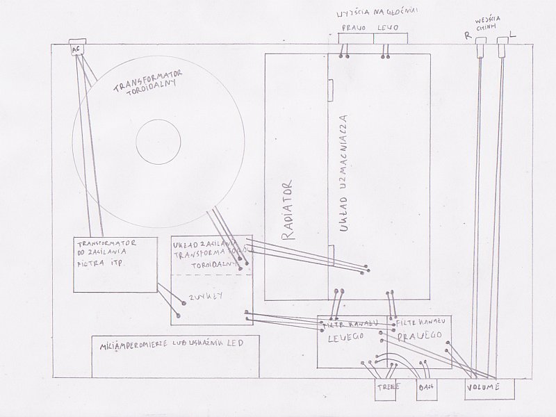 Narysowałem sobie taki wstępny projekcik wzmacniacza. Mam więc pytanie czy to co jest na rysunku wystarczy do stworzenia mojego projektu ? Czy trzeba coś dodać a może odjąć lub zmienić ? Co do wzmacniacza to będzie to jakiś prosty układ TDA.