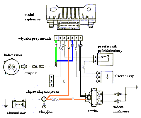 Przewody oznaczone kolorem ZIELONYM i NIEBIESKIM ,to przewody od czujnika wału korbowego,przecięcie chociażby jednego z nich, spowoduje że rozruch silnika będzie niemożliwy. W takim przypadku przewody należałoby pociągnąć do środka samochodu, jednocześnie je maskując. Dlatego lepszym rozwiązaniem jest drugi sposób.Od stacyjki idzie POMARAŃCZOWY przewód, (ten najczęściej jest cięty przez panów od alarmów) trzeba go odnależć i przeciąć, w miejsce przecięte wstawić przełącznik z przewodami.Można również zająć się przewodem CZARNO-BIAŁYM. Po włożeniu kluczyków do stacyjki rozrusznik będzie kręcił,wszystko będzie działać ,ale silnik nie zapali, dopuki nie zostanie włączony. Natomiast co do przełącznika, to należy go zamontować... wg. swojego uznania. Skuteczność tej metody zależy od: pomysłowości w montażu przełącznika, doboru przewodów(aby się nie wyróżniały) oraz od odpowiedniego maskowania przecięć przewodów (można to zrobić izolacją, owijając jednocześnie całą wiązkę w miejscu przecięcia).