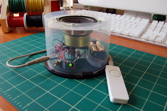 Oto kolejny wzmacniacz do iPoda, tym razem wykorzystujący stare opakowanie na płyty CD-R.