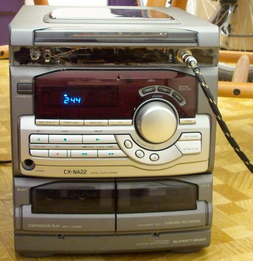 Zacząłem od wyrzucenia całego mechanizmu do zmiany płyt, razem z mechanizmem napędzającym, laserem i płytką z obwodami sterującymi. Szybko znalazłem, gdzie znajdują się wejścia audio na płycie głównej, gdzie przesyłany był sygnał audio z CD. Użyłem go, aby właśnie tam podłączyć gitarę, bez utraty radia i odtwarzacza kaset. Wzmacniacz uruchamiałem przez wybranie na wieży CD.