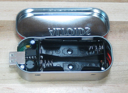 Projekt pozwala zbudować przenośną ładowarkę na baterię. Jest to konstrukcja mała i prosta, ale za to bardzo wydajna i idealnie nadają się jako konstrukcją do samodzielnego zbudowania. urządzenie umożliwia ładowanie iPoda (lub innych odtwarzaczy mp3), kamer, telefonów komórkowych i innych urządzeń, które można ładować z portu USB. Układ ładowarki wykorzystuje tylko dwie baterie AA, przez co jest bardzo mały i możliwy do wbudowania w aluminiowe opakowanie po gumach do żucia. Sprzęt jest bardziej wydajny niż podobne ładowarki zasilane z baterii 9 V