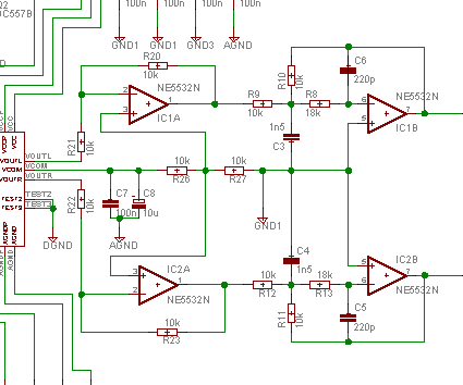 Obserwując oscyloskopem przebiegi na wejsciu i wyjsciu widać że zygnał powyżej 10kHz jest tłumiony można by być zadowolonym, niestety sygnał na wyjściu jest mocno zaszumiony.