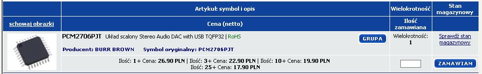 Poniżej dość dobry projekt karty dźwiękowej (np. do korzystania ze słuchawek) podłączanej do komputera przez USB. Wykorzystuje ona chip PCM2706 (dostępny za cenę około 10zł). Jest to 16-bitowy konwerter cyfrowo analogowy wyposażony w wyjścia stereo i wyjście cyfrowe S/PDIF. PCM2706 ma wbudowany interface dla wejść USB 1.0 i USB 2.0 i jest zasilany bezpośrednio z portu USB. Jest to urządzenie typu plug-and-play nie wymagające, żadnych dodatkowych sterowników pod Windows XP.