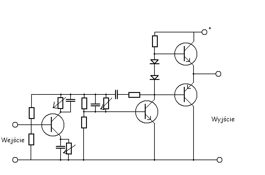 Znalazłem taki schemat i mam kilka pytań związanych z tym schematem. Przede wszystkim czy można go uruchomić jako wzmacniacz. Z powodu braku oprogramowania i zamazanego schematu przerysowałem go na paint Tranzystory mocy to najprawdopodobniej bc212 i 211. Do preampu chyba bc 107 i 109. Czy on będzie działać? czy może mi ktoś podać wykaz elementów? Z góry dzięki.